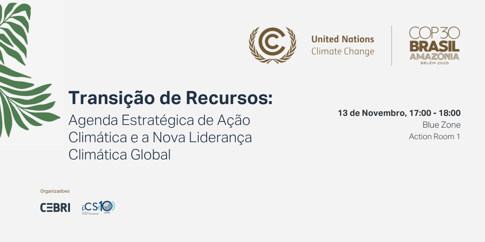 O evento discutirá como as transformações geopolíticas e geoeconômicas estão redefinindo a governança climática global, com foco na transição de recursos naturais essenciais — minerais, energia e terras — e em seu papel estratégico na implementação do Acordo de Paris. A sessão abordará os riscos do “colonialismo verde”, as disputas por soberania sobre recursos, e os desafios para restaurar a liderança e a confiança na agenda climática global.