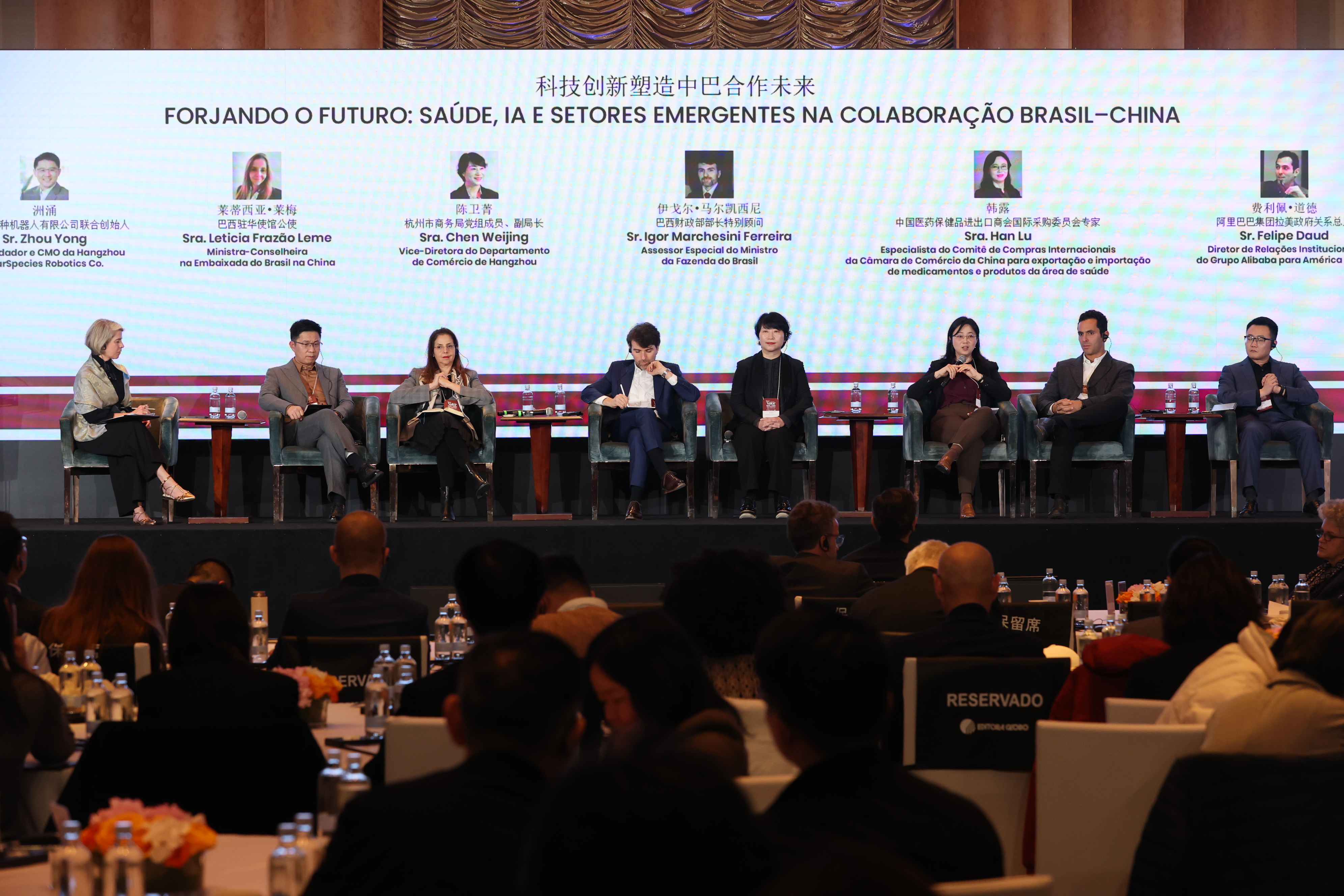 A discussão reuniu Zhou Yong, Co-fundador e CMO da Hangzhou StarSpecies Robotics Co.; Letícia Frazão Leme, Ministra-Conselheira na Embaixada do Brasil na China; Chen Weijing, Vice-Diretora do Departamento de Comércio de Hangzhou; Igor Marchesini, Assessor Especial do Ministro da Fazenda; Han Lu, Especialista da Câmara de Comércio da China para Importação e Exportação de Medicamentos e Produtos de Saúde (CCCMHPIE); Felipe Daud, Diretor de Relações Institucionais do Grupo Alibaba para a América Latina; e Hui Jingbo, Diretor de Marketing da Hangzhou Zhizhen Technology.