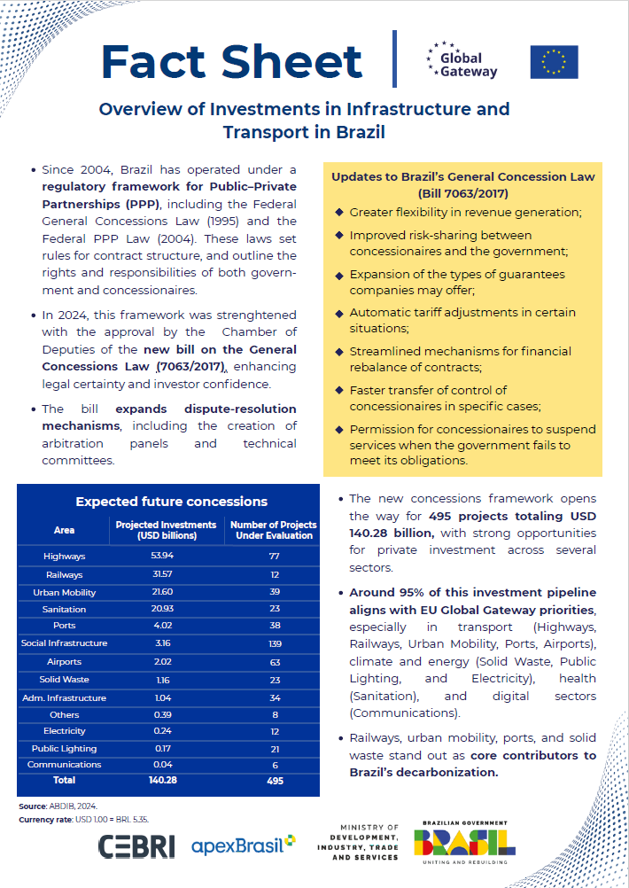 • From a climate perspective, the factsheet draws on data from Phase 2 of the Energy Transition Program (PTE2), led by CEBRI in partnership with institutions such as BNDES and the IDB. The findings indicate that shifting freight transport toward railways and waterways, as well as promoting urban e-mobility, are key measures for reducing emissions in the transport sector; this creates a market for European technologies in rail systems, charging infrastructure, and logistics-efficiency solutions.