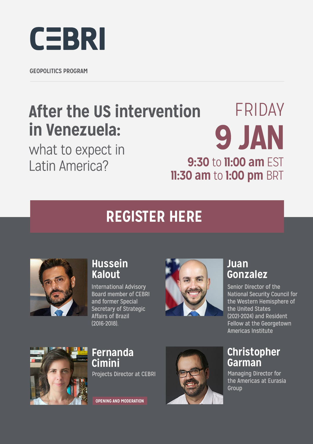 Recent developments following the United States’ military involvement in Venezuela have raised profound concerns about regional stability, international law and the future of political autonomy in Latin America. The use of force on sovereign Venezuelan territory, including air strikes and the capture of a head of state, represents a significant escalation that exceeds established norms of international coexistence and reintroduces coercive practices in a region that has long sought to consolidate itself as a zone of peace. Against this backdrop, the event seeks to gather insights and key perspectives on the political, strategic, and security implications of the Venezuela crisis and the broader Trump Corollary for Latin America. Particular attention will be given to the prospects for renewed regional integration as a necessary condition to contain interventionist dynamics, strengthen diplomatic coordination, and reassert Latin America’s role as an autonomous actor in an increasingly fragmented and competitive international system.