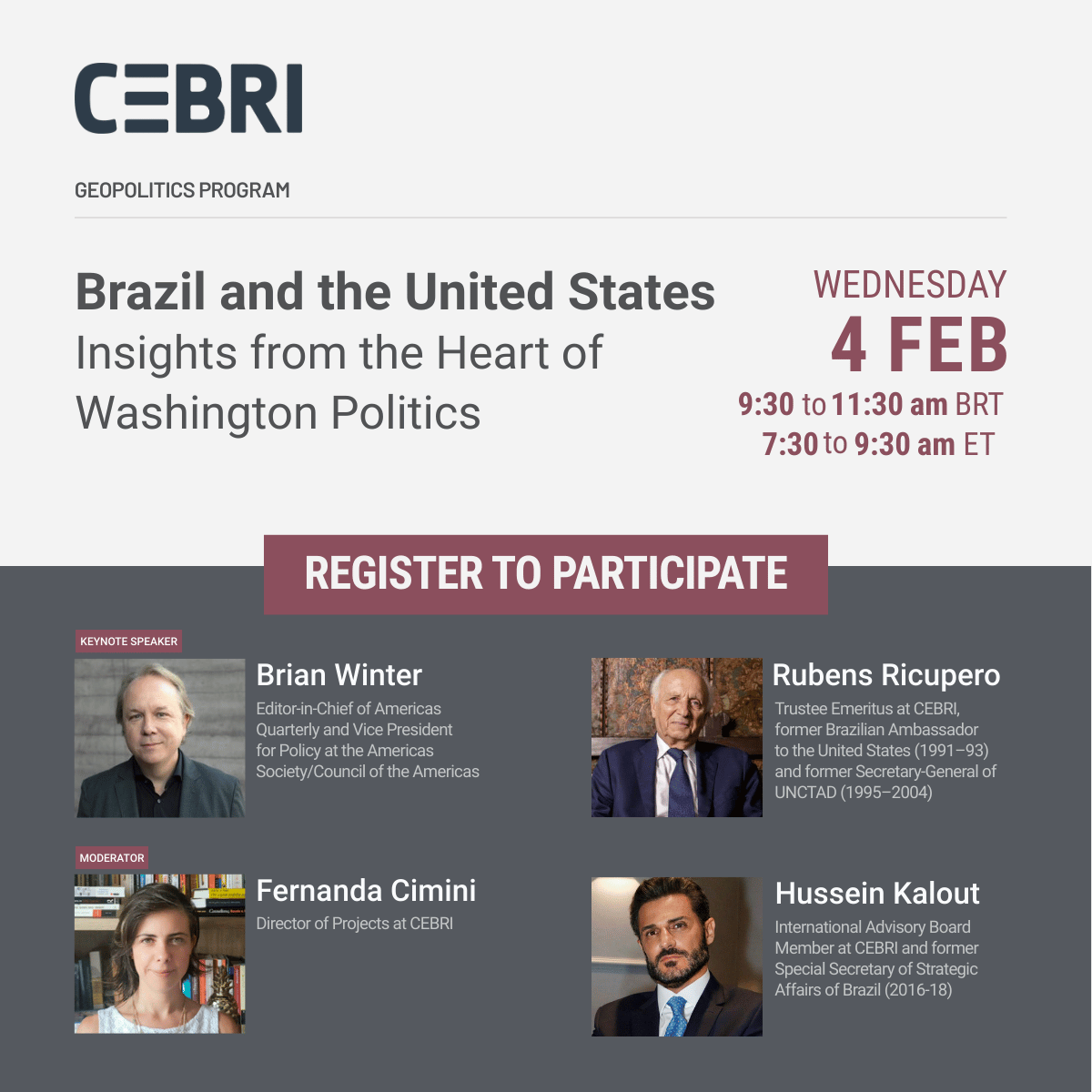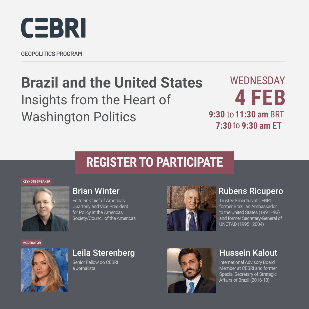 The event will focus on current trends in Washington decision-making, the priorities of U.S. policymakers toward Latin America, and potential implications for Brazil.