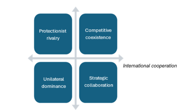 Scenario construction necessarily involves theoretical assumptions that guide the likelihood of potential events and behaviors. When it comes to international trade, two axes can help structure the scenario construction plan: the level of global tensions (shown on a vertical axis) and the dynamics of international cooperation (horizontal axis). The intersection of these two axes results in four scenarios: protectionist rivalry, strategic collaboration, competitive coexistence, and unilateral dominance (see Figure 1).